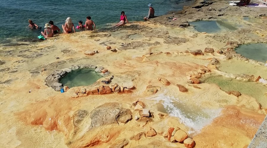 Aidipsos, in the northwestern part of the island of Evia, is one of the most popular Greek spa towns and destinations. It is perhaps the most famous spa town in Greece. Historically, the area has been visited by Roman emperors such as Hadrian, Marcus Aurelius and Constantine the Great. There are about 60 hot springs in and around Aidipsos. The waters rise from a depth of 2.5 km and have a temperature of between 34 and 71.2 °C, and also contain minerals such as potassium, calcium, magnesium, iron and sodium.